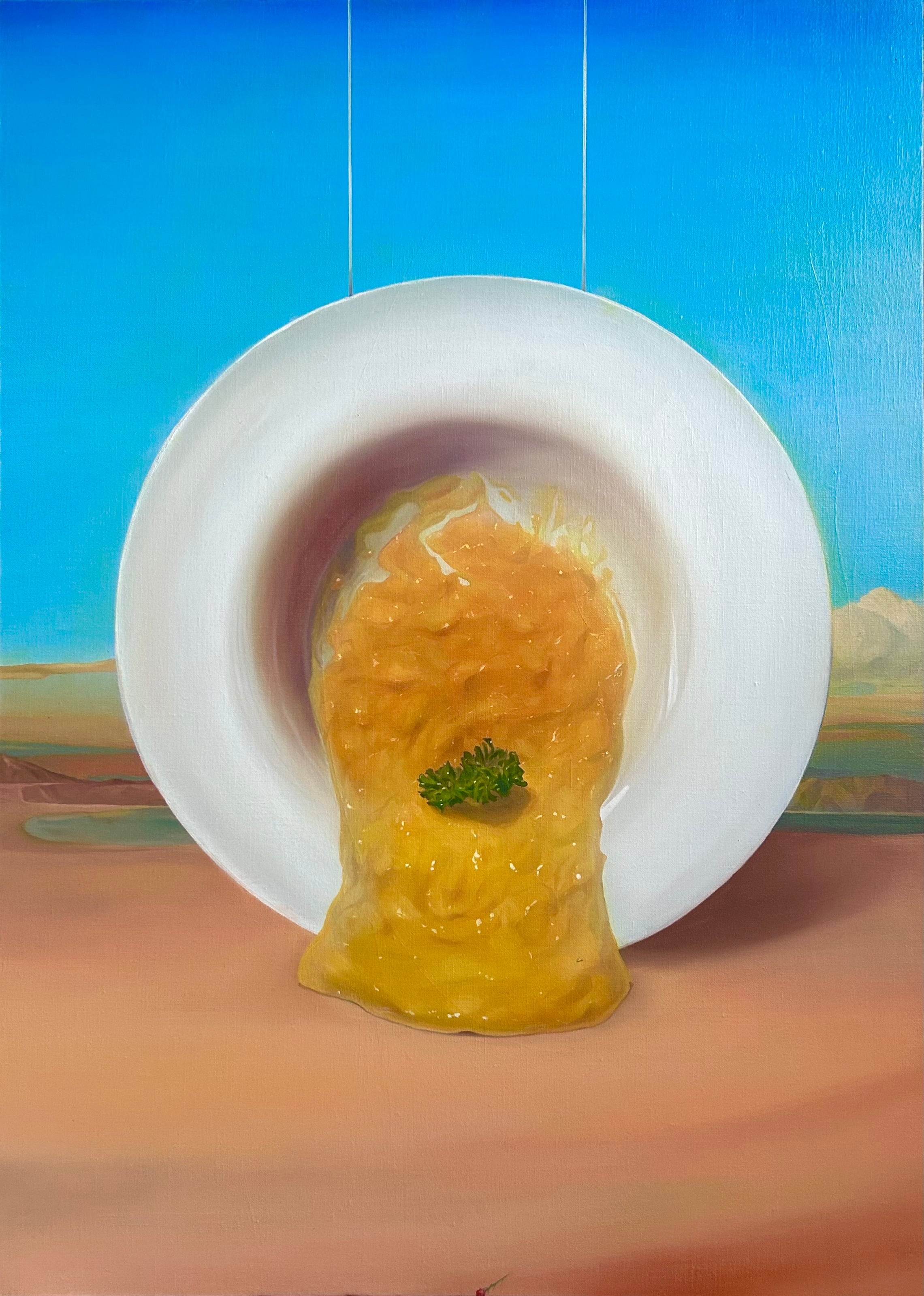 食卓が親子を繋いでいる。この作品を描いた当時、私は一人暮らしを始めたばかりでした。ごはんを一緒に食べながら今日あったことを話す。その行為の大切さをしみじみ感じており、最近でも時折感じています。そんな心境の中、ある親子を題材にしたフランス映画を見ました。親子はある食事シーンでスープを食べていました。何のスープかはわかりませんでしたが、そのシーンが一番印象に残り、その謎のスープをモチーフとすることにしました。親子揃う食卓というのは暖かいオアシスのようなもの。そう、私は思っています。